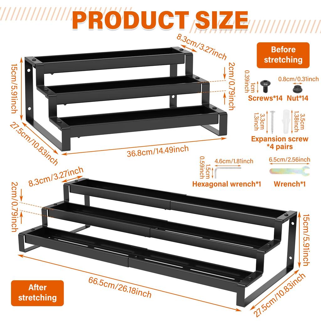 3 Tier Expandable Kitchen Storage Rack Carbon Steel Spice Bottle Rack With Fence Telescopic Seasoning Jar Organizer for Home