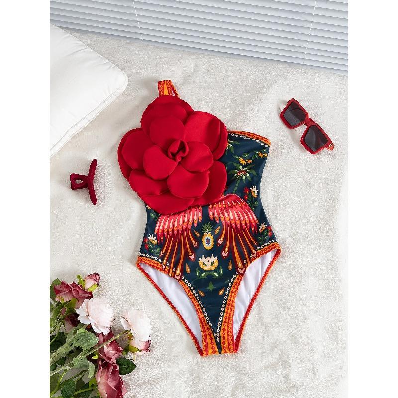 Moda Fiore sulla Spalla Costume da Bagno Intero Sexy Monospalla da Donna Body Stampato Costumi da Bagno Abbigliamento da Spiaggia per Vacanze Femminile