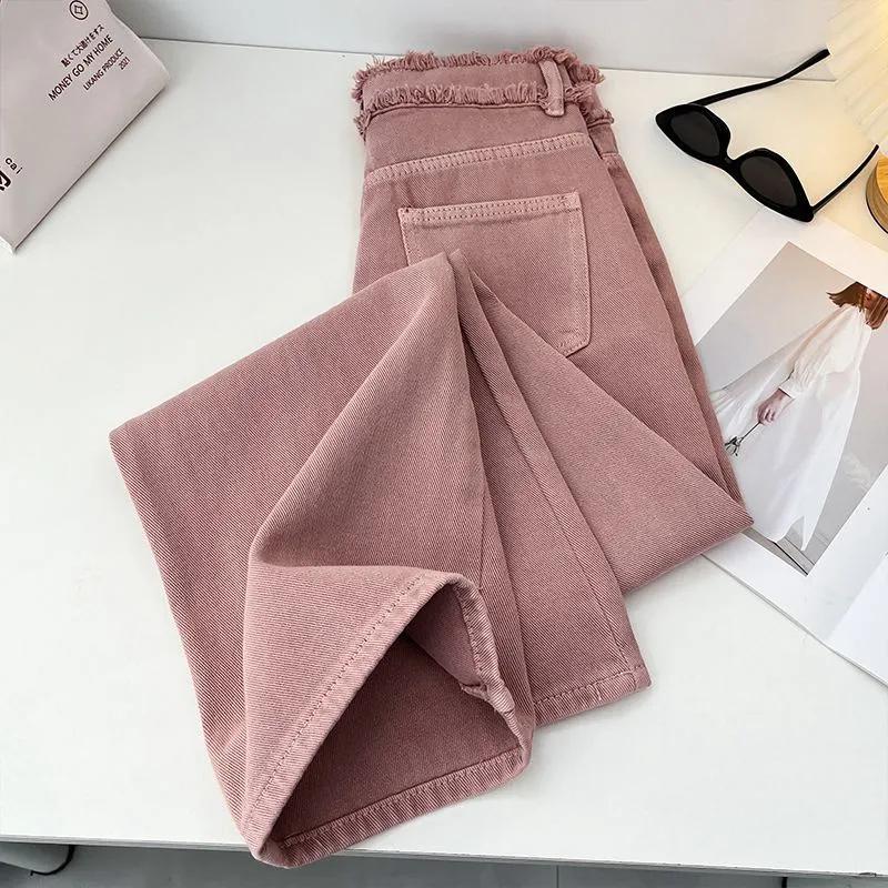 Pantaloni da Donna Primavera/Autunno Vita Alta Modellanti Larghi Gamba Dritta Lunghi Fino al Pavimento Rosa Pantaloni in Denim a Gamba Larga