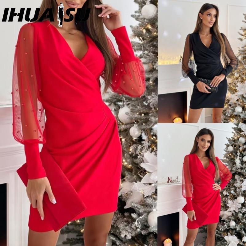IHUASU Abiti casual a maniche lunghe con scollo a V e stampa a tinta unita, alla moda autunnale e invernale da donna