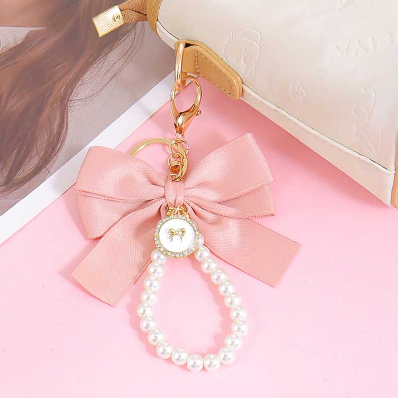 1Pc Cute Big Bow Charms Keychains with Imitation Pearl Bead Wristlet for Women Car Trinket Accessories Keyrings Bag Pendant Gift
