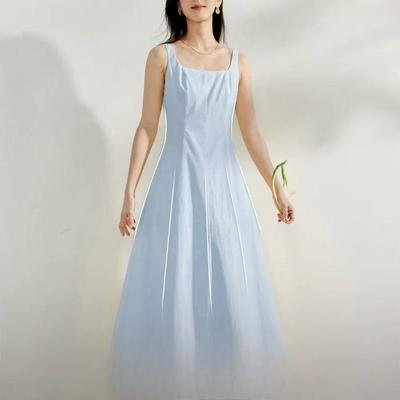 Abito Senza Maniche Stile Francese Avvitato in Vita per Donna Primavera Nuovo Drappeggiato con Bretelle Gonna Lunga