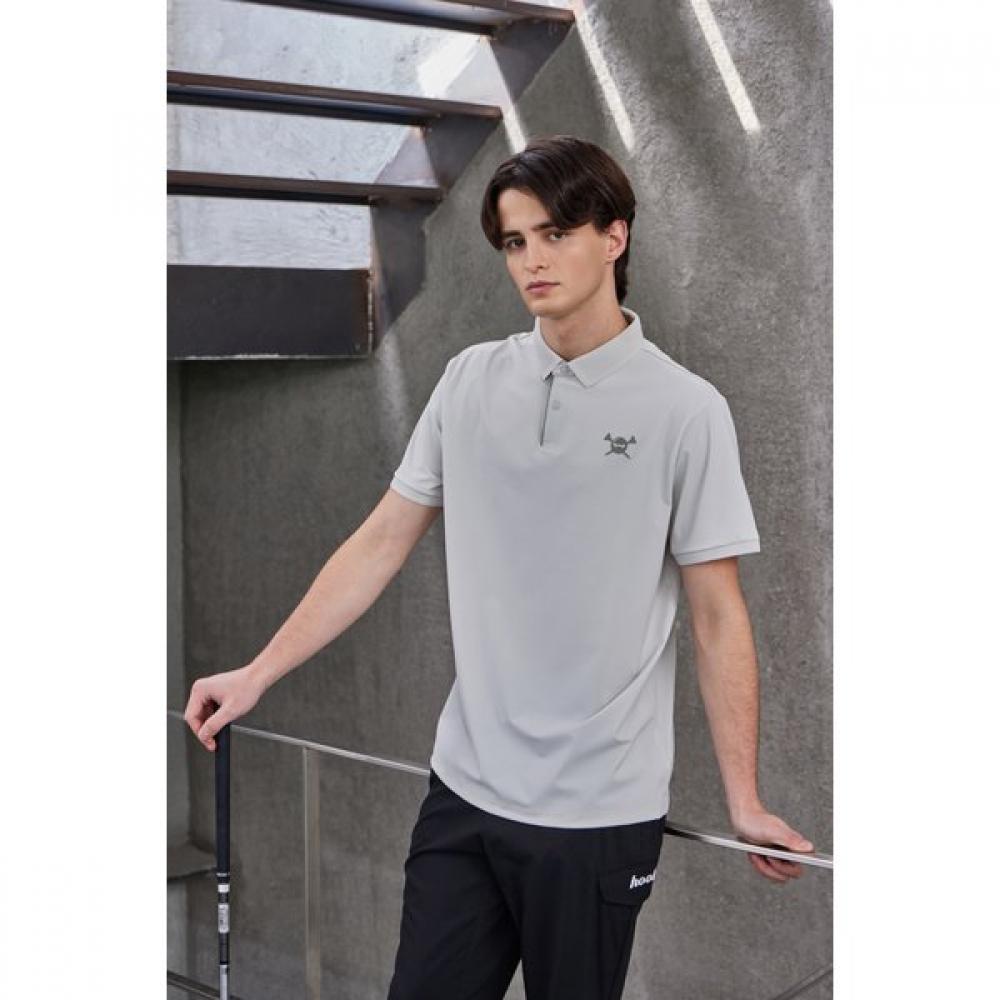 The collar and sleeve hems feature a contrasting color point, and the back neck has an embroidered logo detail, providing a standard silhouette for comfortable movement.
