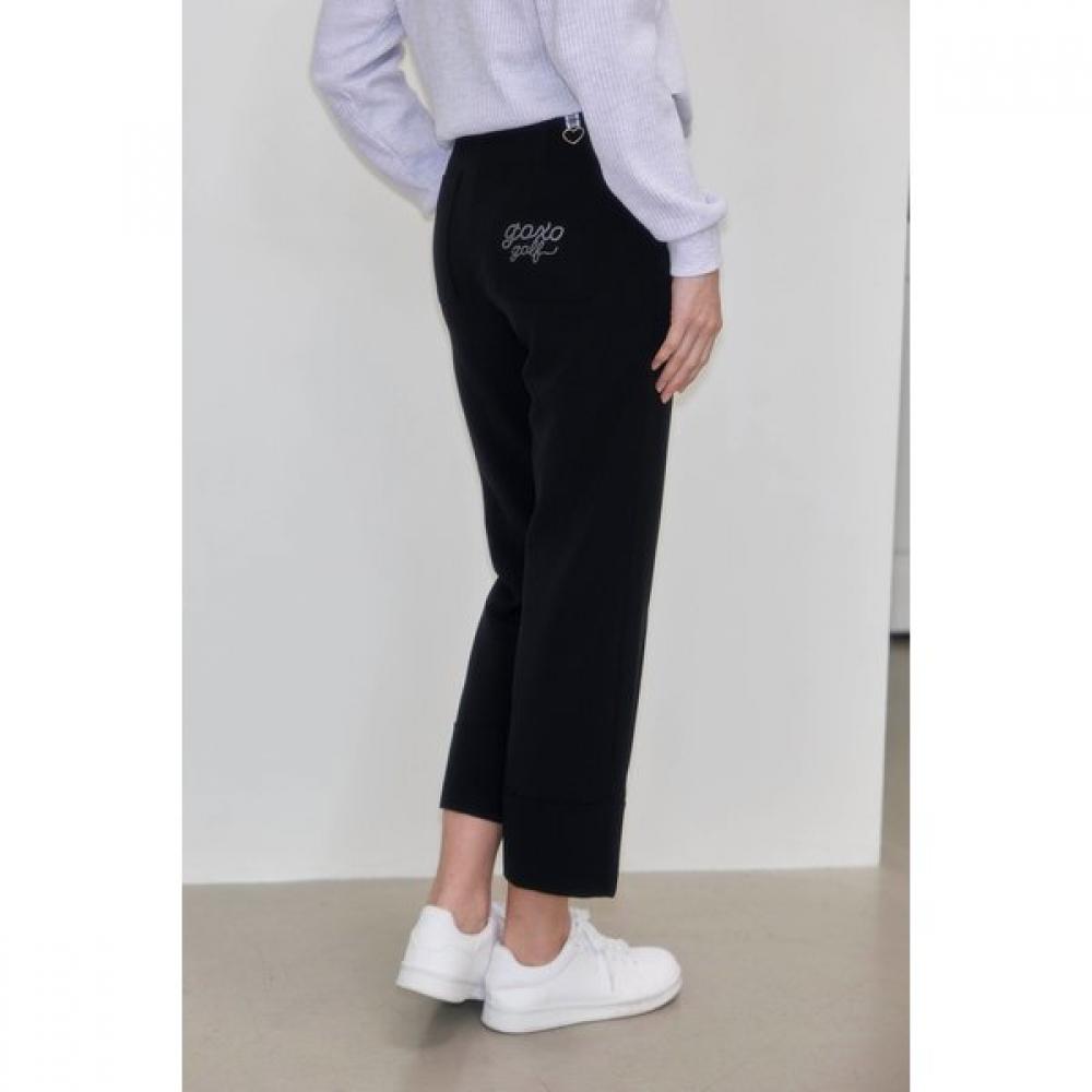The Goexo Lettering Woman Fit Cabra Pants Black are golfwear pants for women. The ankle area is subtly tapered to create a sleek silhouette. Design features include lettering detail on the back pocket.