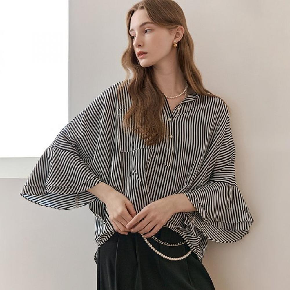 The Mazha Stripe Pin-Tuck Ruffle Sleeve Blouse ZD06QB500ON features a striped pattern combined with pin-tuck details and ruffle sleeves, creating a loose-fit blouse that emphasizes feminine sophistication and elegance.