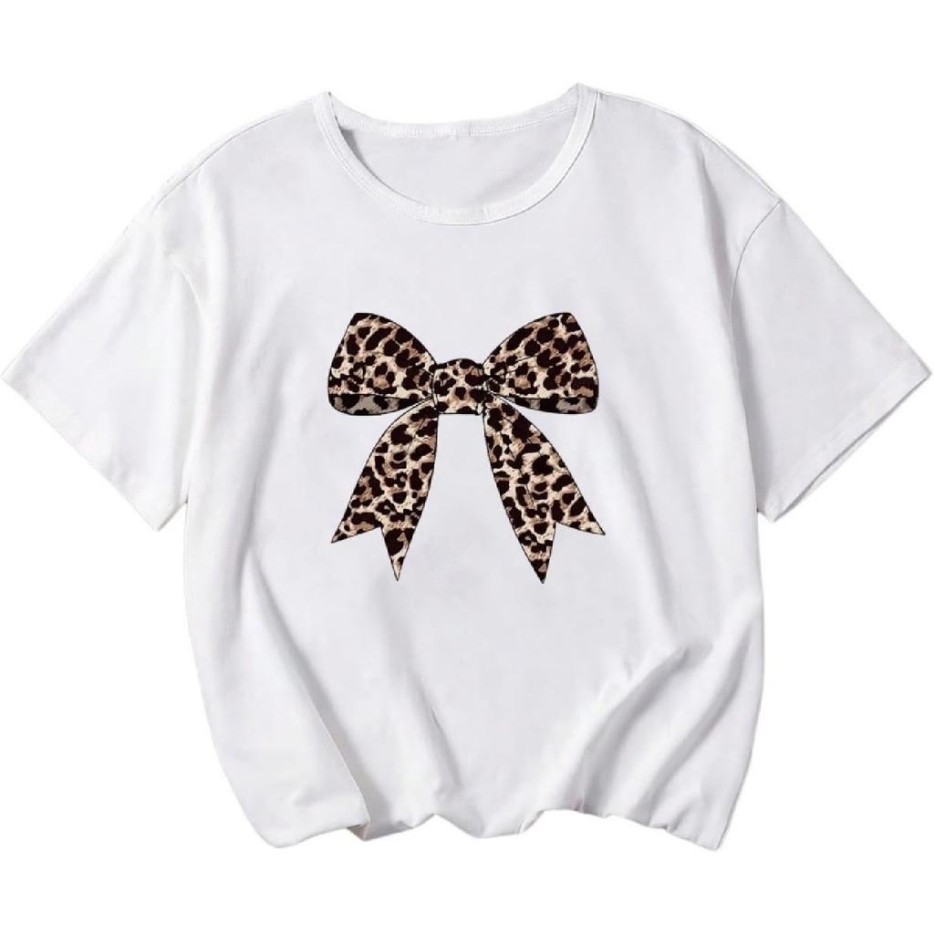 Girl's Bow Graphic Tees Short Sleeve Crewneck Crop Tops Cute Shirts Slim Fit Summer T Shirts