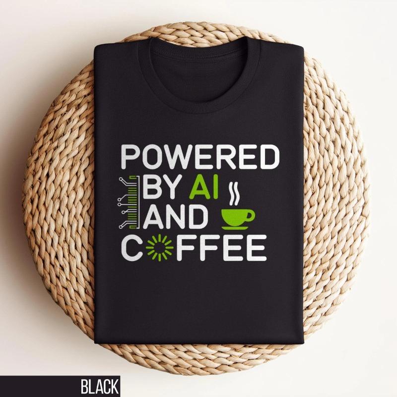 Powered By AI and Coffee Tshirt Male and Female Funny Geek AI Tshirt Coffee Enthusiast Tshirt Humorous Quotes Tshirt