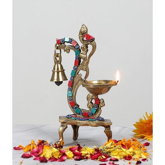 Two Moustaches Gemstone Work Ethnic Carved Peacock Design Pure Brass Diya with Bell