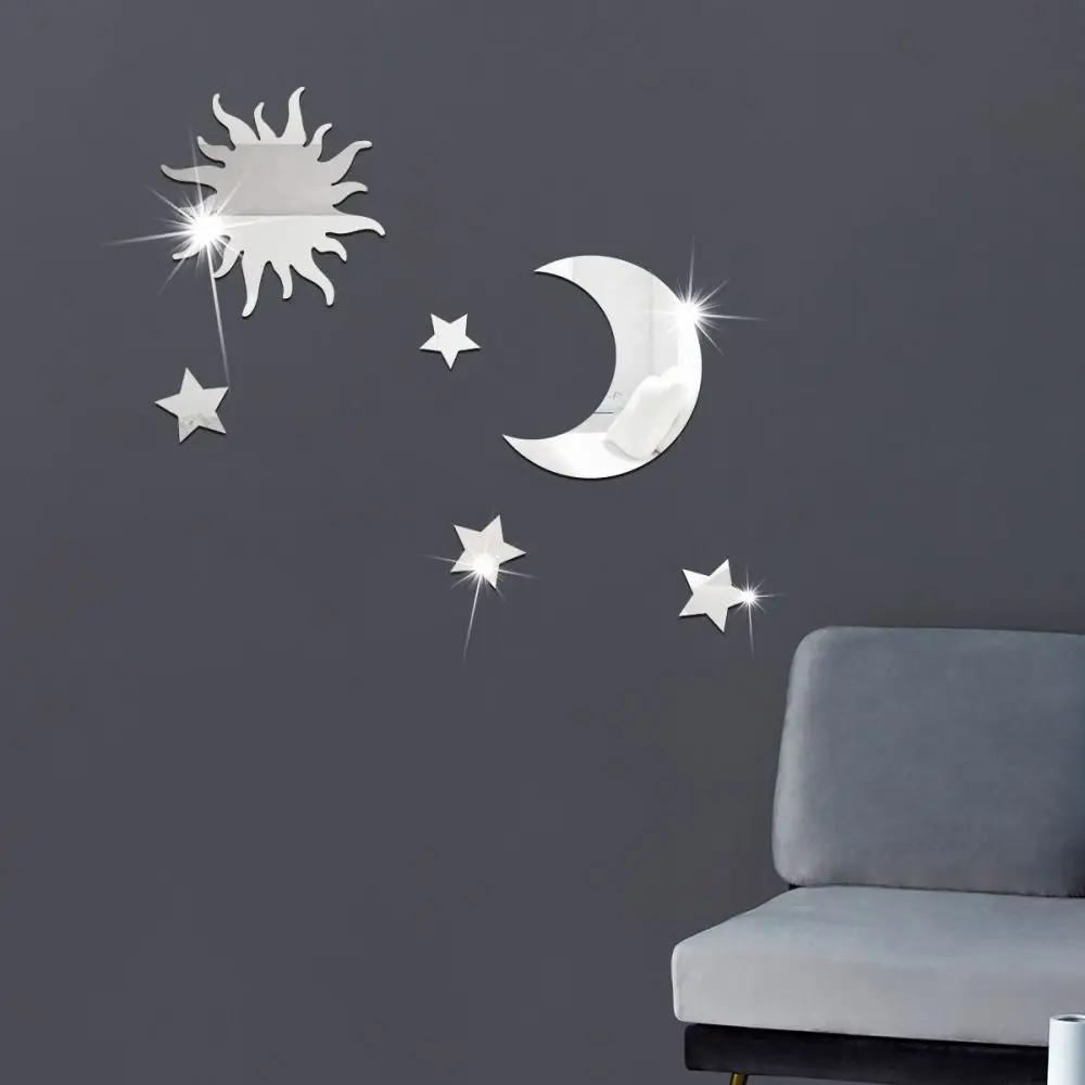 6PCS NEW Gold Silver Gold Mirror Wall Stickers DIY Acrylic Star Moon Decal Stereo Self Adhesive Decorative Decal Bedroom Sticker