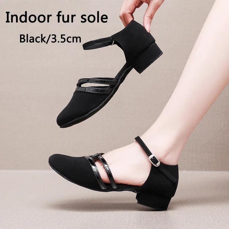 Ladies Ballroom Latin Dance Shoes Black Salsa Shoes Low Heel 3.5cm Samba Tango Shoe Soft Sole Party Ballroom Shoes