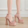 Ladies Pink Heels Fashion Chunky High Heel Platform Sandals Square Toe PVC Bowknot Crystal Ankle Strap Women's Dress Shoes 35-42