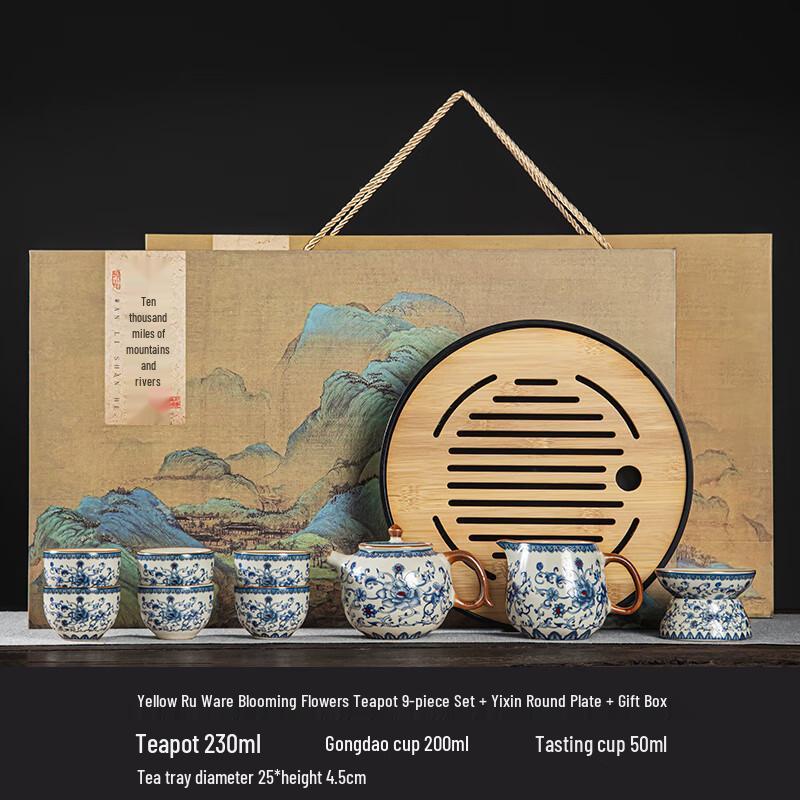 Lainuo Ru Kiln Floral 9-Piece Tea Set with Plate & Gift Box