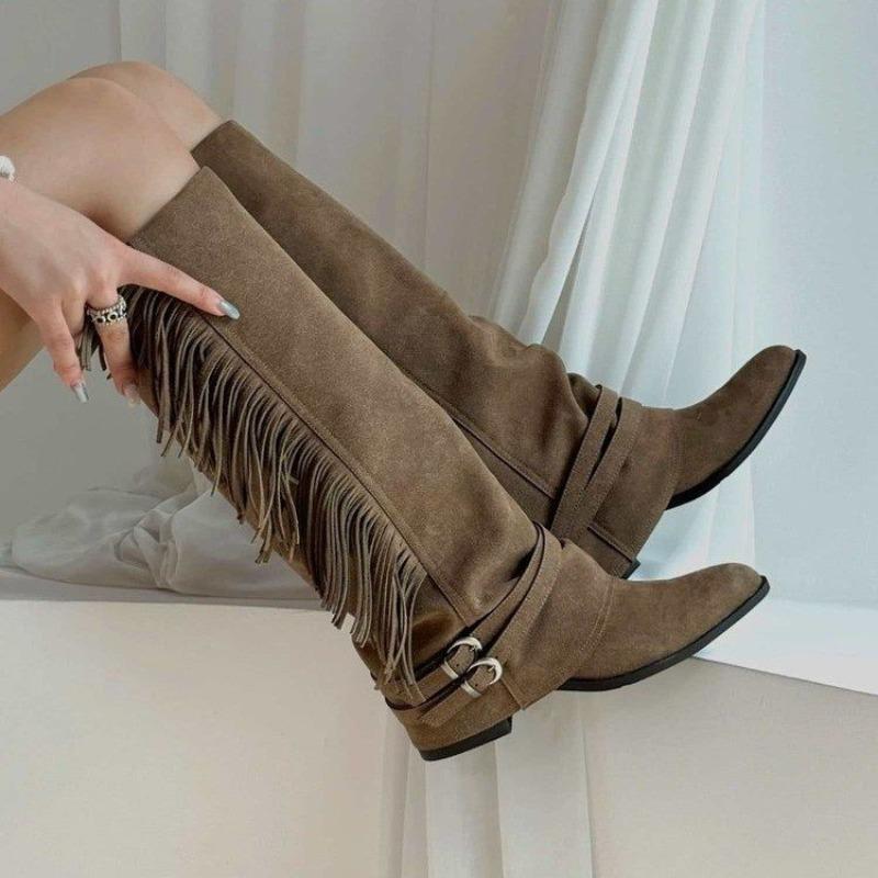 Stivali Alti in Pelle Scamosciata Autunno Nuovi Punta Appuntita Fibbia Cinturino Frange Suola Morbida Antiscivolo Tacco Blocco