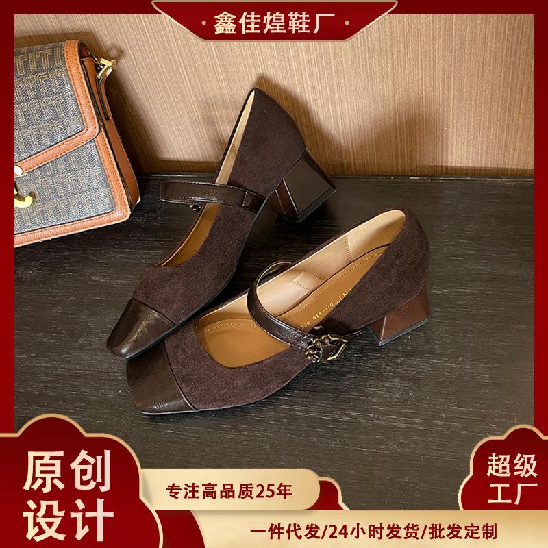 332-77 Cashmere splicing square head thick heel single shoes middle heel soft leather one-word buckle Mary Jane shoes spring and autumn
