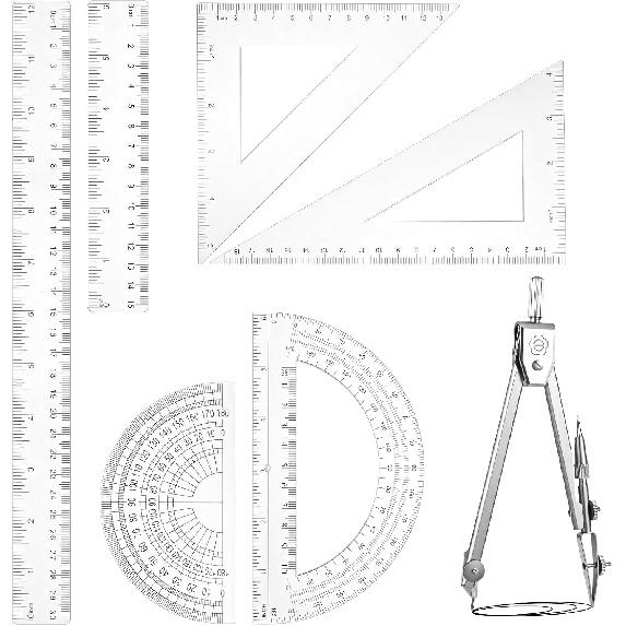 7PCS Geometry Math Set Plastic Clear 45/60 Degree Triangle Ruler 12 and 6 Inch Math Ruler 4 and 6 Inch Protractor and Compass Set with Box Measuring