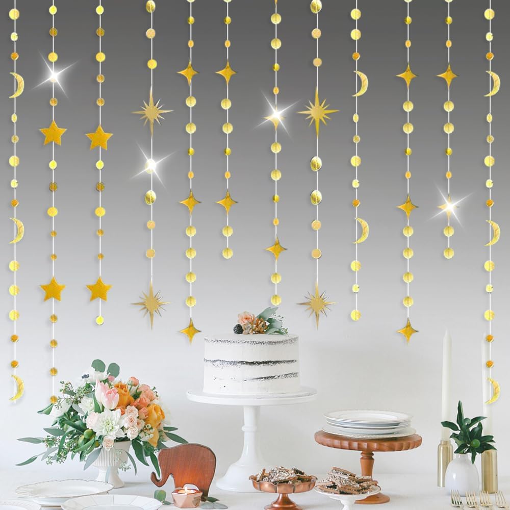 【Charming Design】 With dreamy colors and exquisite styles, these party supplies are sure to catch your guests’ eyes. Each strand is adorned with moons, stars, celestial dots. Their gold sheen and sparkling details work together to transform your event into a magical starry night, creating an enchanting atmosphere for your celebration.