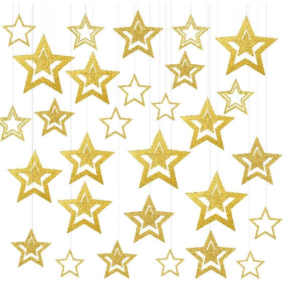28PCS Gold Hanging Stars Decorations Glitter Cutouts with 7 Sizes Star Wall Decorations Double Sided Hanging Yard Decor for Party Wall Decor