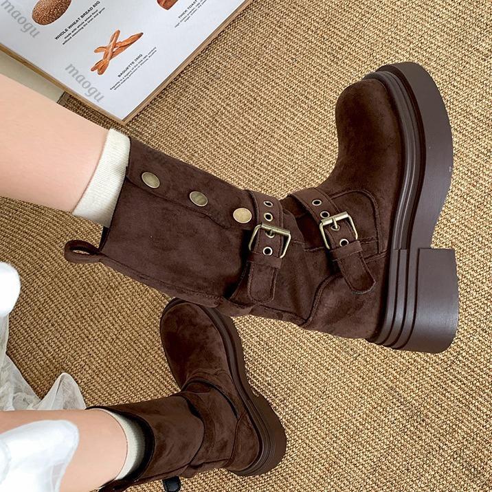 Designer Shoes Woman Buckle Knight Boots for Women Fashion New Faux Suede Mid-calf Botas Slip-On Thick Heel Platform Booties