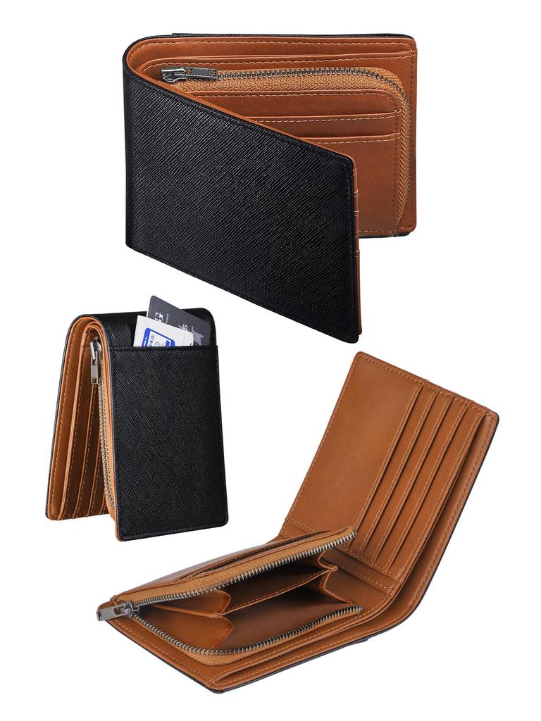 GSG Bifold Genuine Cowhide Exterior Card 13 Zippered Coin Large Popular Perfect Day Embossed Black and Brown Men's Wallet, Leather, Holder, Cards,