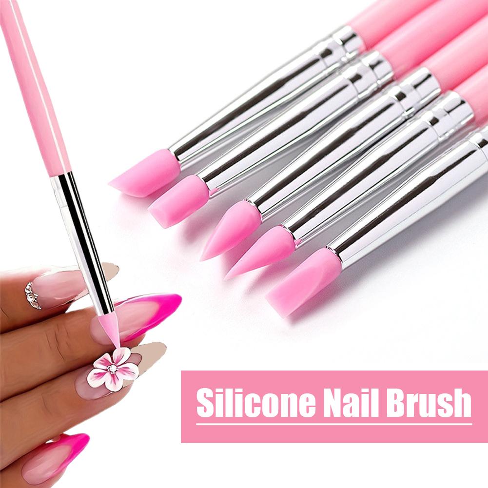 5 Pezzi Pennello per Unghie in Silicone Intaglio Goffratura Vuoto Modellante Gel Rosa Nail Art Scultura Penna Pennelli da Disegno
