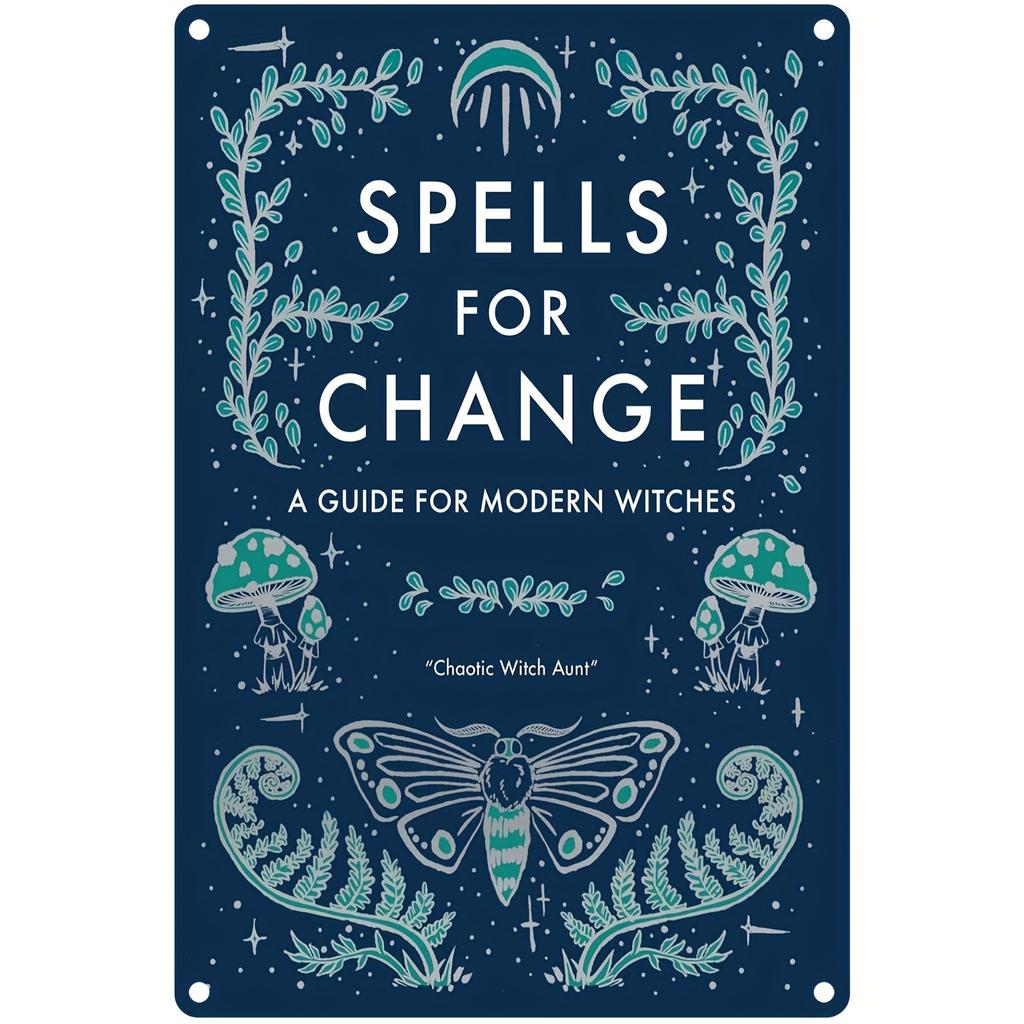 Cartello Metallico 'Spells for Change' Scatola di Latta Vintage Guida alla Stregoneria Arte da Parete con Funghi Incantevoli Farfalle Stelle Perfetto