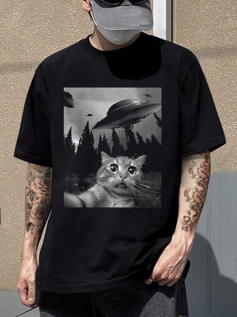 Mens casual Tshirt cute cat and UFO print short sleeved loose fit Made of pure cotton comfortable and meticulously crafted