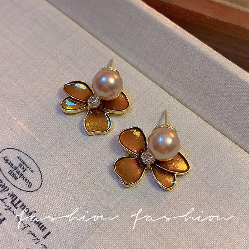 French flowing gold flower pearl earrings 2025 new temperament light luxury high-end stud earrings popular earrings