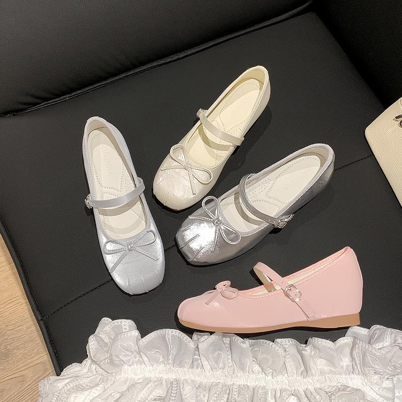 Inner heightening bow Mary Jane shoes new temperament round head word with light mouth thick heel versatile silver single shoes women