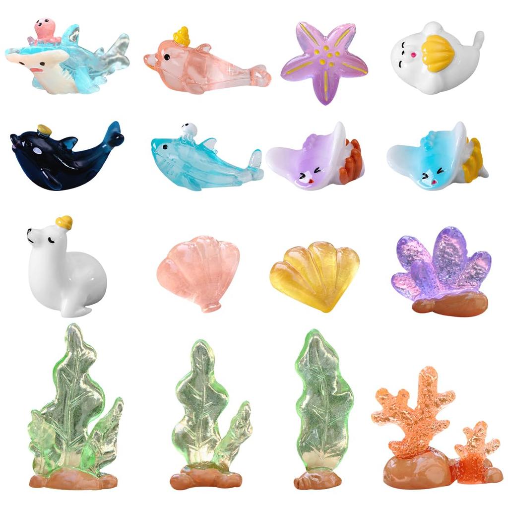 HyzaPhix Miniature Aquarium Fish Tank Dolphin Whale Shark Seashell Marine Life Set of 16 Cute Mini Figurines Fish Figures Decorative Objects Scenery