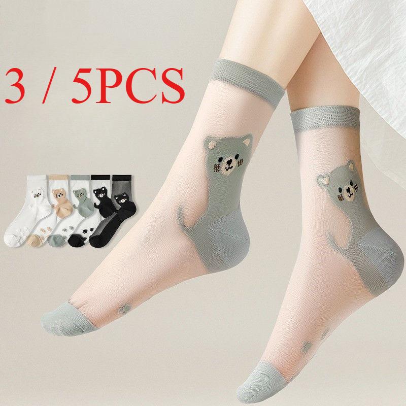 3/5 Pairs Cartoon Bear Sheer Mesh Socks for Women Breathable Transparent Ankle Socks Thin Summer Socks Cute Animal Pattern Socks