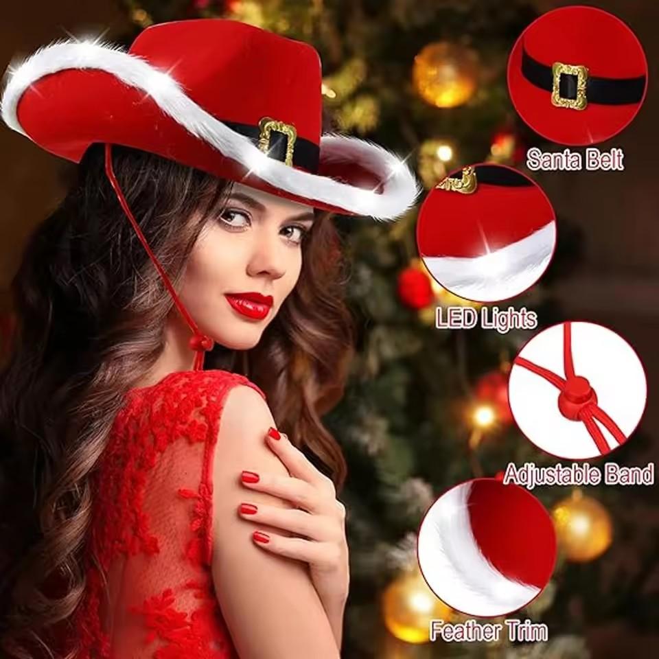 Fashion Santa Claus Party Christmas Luminous Cowboy Hat Western Red Felt Hats Wide Brim Cowgirl Hat Jazz Hat for Women Men