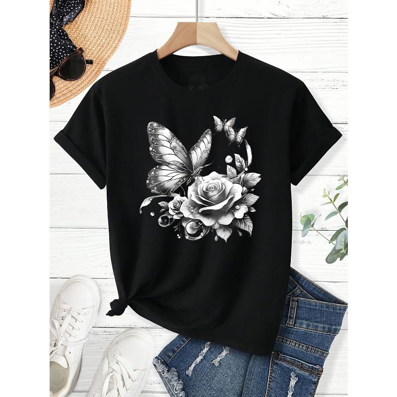 European sizes Women's Soft Breathable Black Round Neck Graphic T-Shirt Butterfly Rose Vintage Print Casual Daily Top