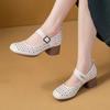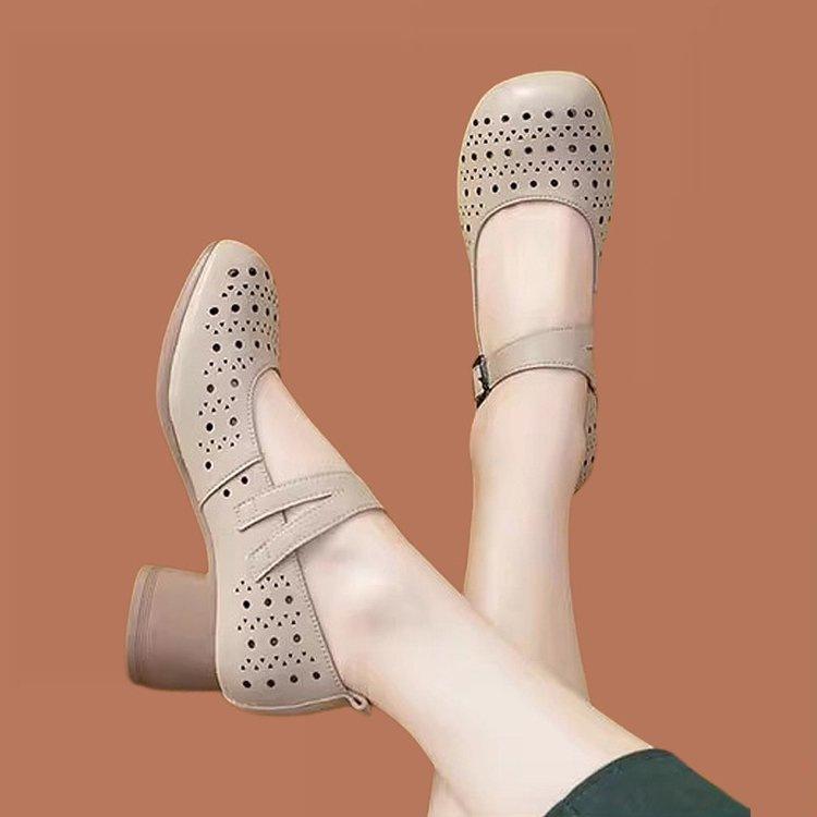 Soft-soled hollow-hole shoes Comfortable middle-heeled sandals Summer new soft leather thick-heeled shallow mouth Mary Jane