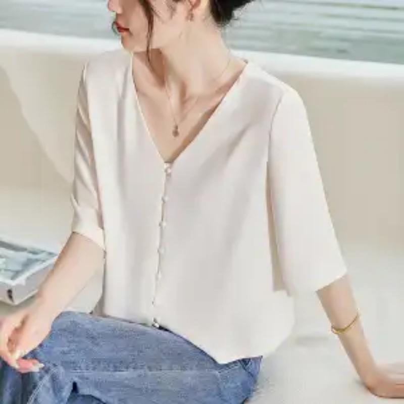French Light Mature Top for Women Summer New V-neck Shirt Foreign Short Style