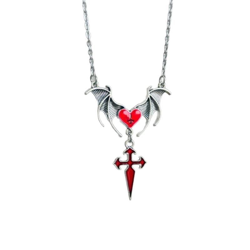 This unique bat wing crosses necklace combines punk and gothic styles with heart and detailed bat wing making it a standout accessory in gothic jewelry.