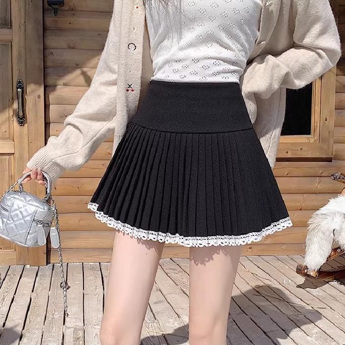Elevate your style with this enchanting high-waist skirt, expertly crafted from premium wool for a sophisticated and comfortable wear. Its elegant pleated design is adorned with delicate lace-trim detailing, adding a touch of charm and femininity. Perfect for transitional seasons, this skirt effortlessly combines warmth and fashion, making it an ideal choice for any chic wardrobe.