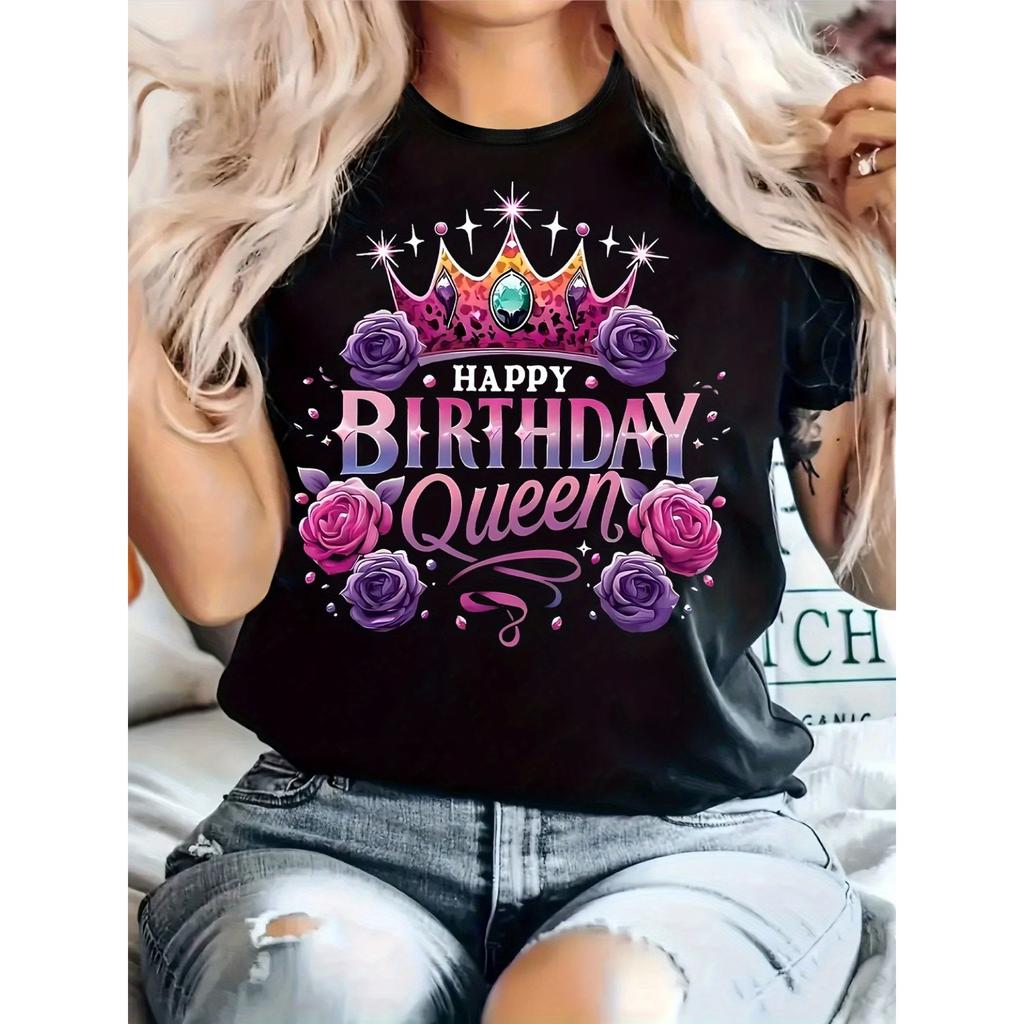 Women'S "Happy Birthday Queen" Graphic T-Shirt - Vibrant Pink & Purple Design with Crown & Roses, Casual Crew Neck, Short Sleeve, Slight Stre