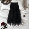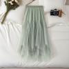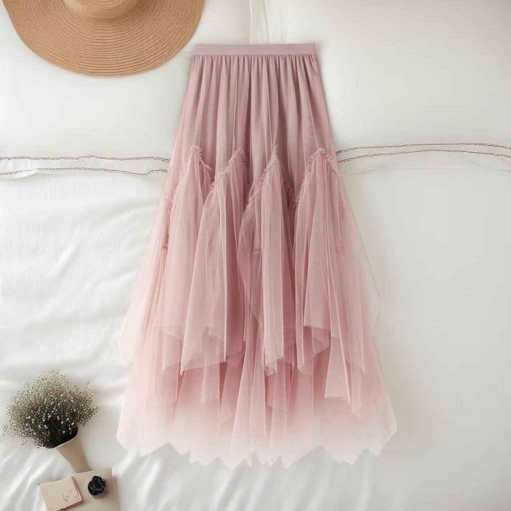 Women's High-Waisted A-Line Irregular Mesh Midi Skirt with Patchwork and Fluffy Hem for Spring/Summer