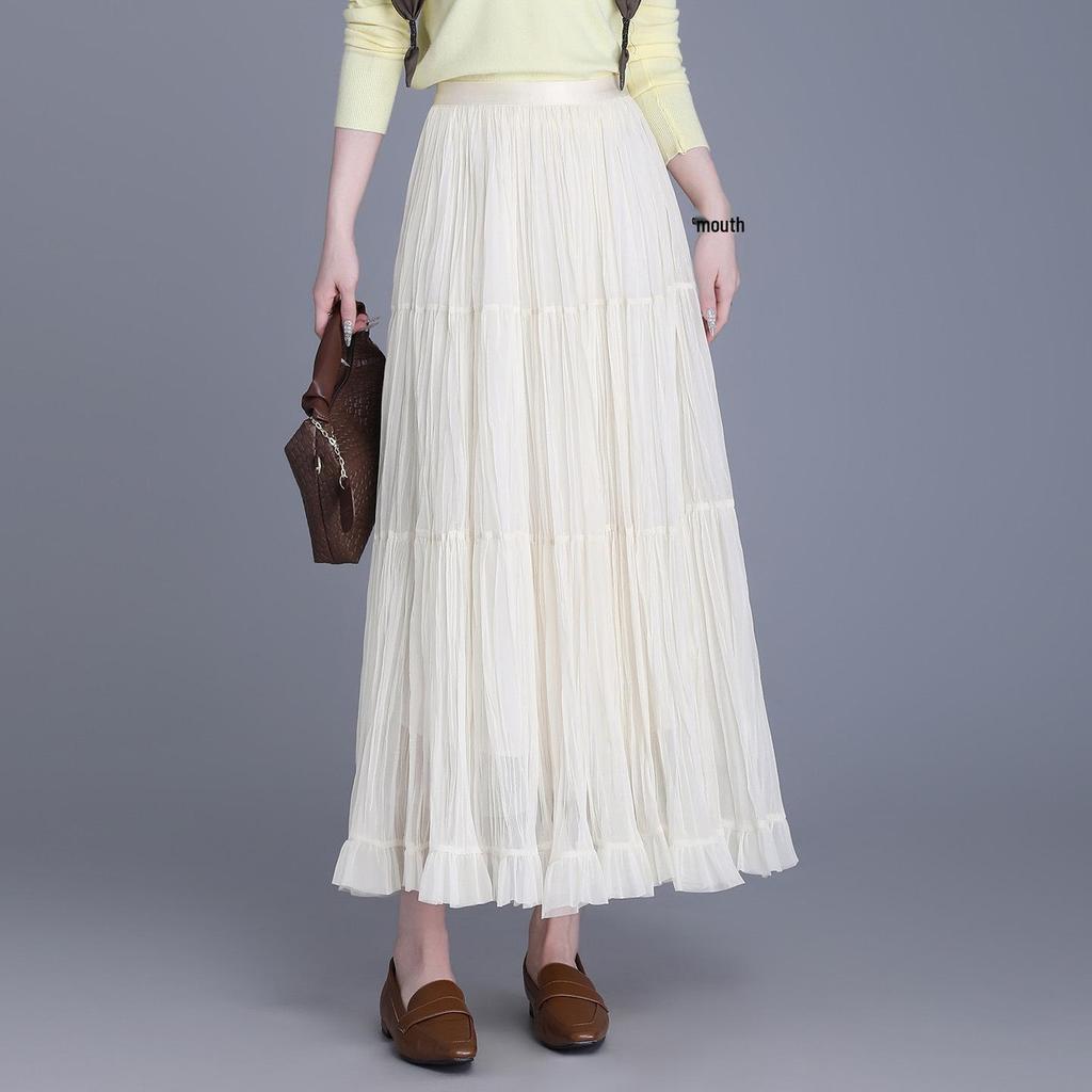 Women's 2026 Retro Ruffled Pleated Mesh Skirt - Slimming Elastic Waist, Early Spring