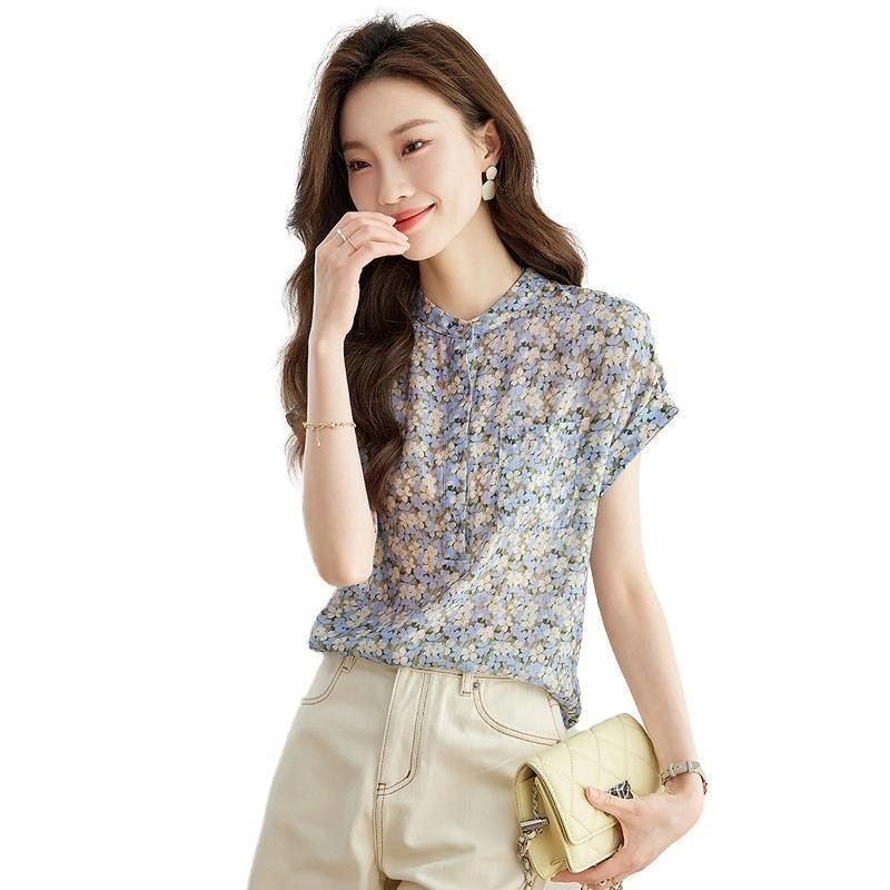 Summer New Floral Chiffon Shirt Women's Short-sleeved Tops Fashionable and Beautiful Small Shirts Stand-up Collar Shirts for Women
