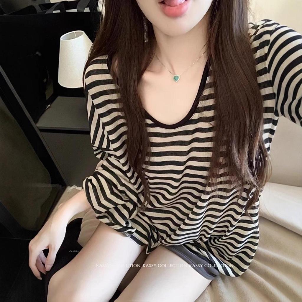 This Women's Striped U-Neck Sun Protection Long Sleeve Oversized Cover-Up T-Shirt is designed for comfort and style. Crafted from lightweight polyester, it offers a soft and breathable feel. The long sleeves provide excellent sun protection, while the U-neckline adds a classic touch. The oversized fit ensures relaxed wear, making it perfect for a day at the beach or a casual outing. Its striped pattern adds a fun and fashionable element to any outfit.