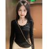 Elevate your spring wardrobe with this chic slim-fit top, featuring a stylish round neck and long sleeves. Crafted from high-quality polyester, it promises both comfort and a flattering silhouette. The unique U-neck design, adorned with eye-catching rivet decorations, adds a touch of edgy elegance to any outfit. Perfect for a sleek and polished look.