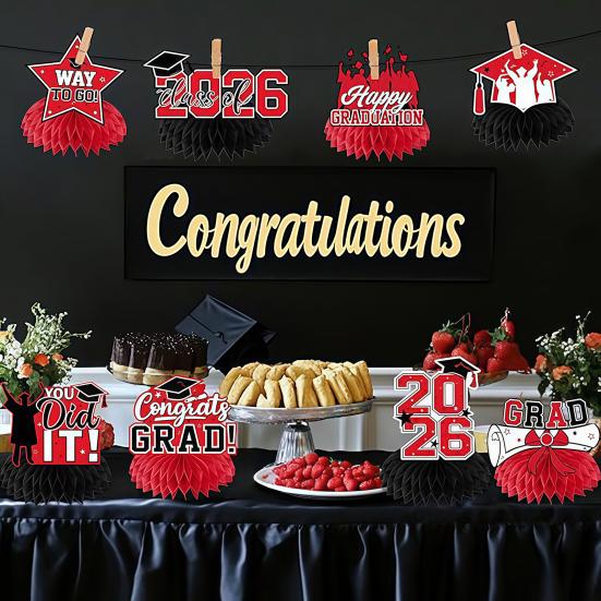 Celebrate your graduate in style with these vibrant graduation honeycomb ornaments, perfect for the Class of 2026. Featuring bold red and black colors, each centerpiece showcases eye-catching phrases like "Class of 2026" and "Congratulations on Graduation," complemented by iconic symbols such as bachelor's caps, stars, badges, and diplomas.