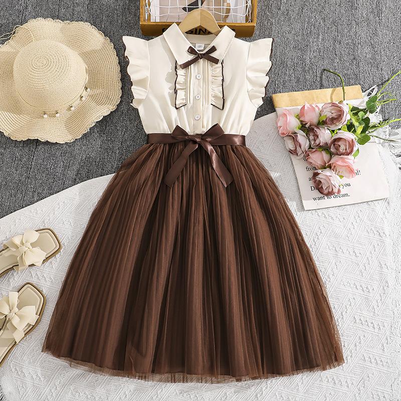 Abito alla moda per bambina - Abito a rete patchwork elegante a maniche corte per bambini Primavera/Estate