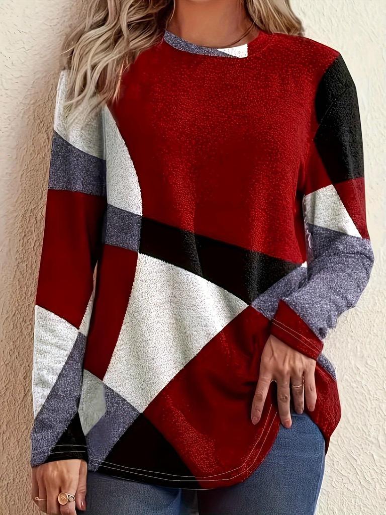 Plus Size Women's Color Block Geometric Print Long Sleeve Top - Multiple Colors, Spring/Autumn Style