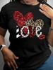 European Size Women's Plus Size T-Shirt- LOVE Heart Design with Leopard Print, Glitter Accents& Stripes, Casual Round Neck Short Sleeve Top