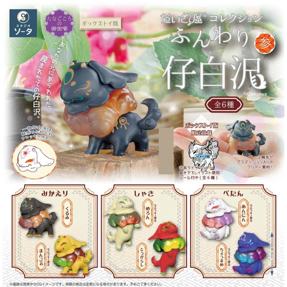 Daikyoya Collection Funwari Kohakutaku 3:1Box (6pcs) is a complete set of trading figures (Gashapon) from the SO-TA brand, including a total of 6 individual figures. Each figure is made of lightweight PVC material and stands about 40-50mm tall, featuring unique food motif characters. This product also adds charm with its chest fur rendered in transparent gradation, enhancing the play of light and mystery.