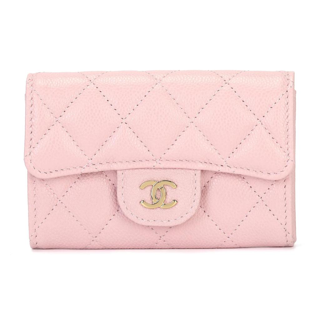 CHANEL 24K Classic Style Vertical Gold Label Double C Logo Quilted Pattern Shiny Grain Calfskin with Gold Metal Card Holder for Women Pink
