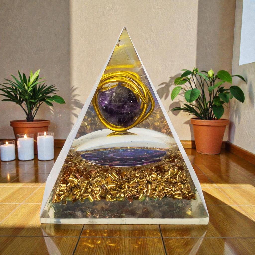 Amethyst in Tradition Amethyst has been valued across cultures for thousands of years. The ancient Greeks believed it prevented intoxication — the name comes from the Greek "amethystos," meaning "not drunk." In Tibetan Buddhist practice, amethyst is used for meditation malas and altar pieces. In European Christian tradition, it was the stone of bishops, representing clarity of mind and spiritual devotion. Across these traditions, the common thread is the stone's association with calm, clear thinking, and protection from mental agitation. In contemporary crystal healing, amethyst is one of the most widely used stones. Practitioners value it for supporting meditation, easing anxiety and mental restlessness, improving sleep quality, and fostering intuitive insight. Pairing amethyst with the orgonite matrix — resin, metal, and the pyramid form — is intended to amplify these qualities while the orgonite structure processes and balances the surrounding energy. The Wire Wrap The amethyst in this pyramid is wire-wrapped before being set in the resin. Wire wrapping is a technique borrowed from crystal jewellery making, where a metal wire (typically copper) is wound around a stone to hold and frame it. In orgonite practice, the wire wrap serves a dual purpose: it physically secures the amethyst in a central position during the curing process, and it creates a direct copper-to-crystal contact that practitioners believe enhances energy conduction between the stone and the surrounding metal matrix. The wrapped stone is visible through the resin as a distinct, framed element — giving this pyramid a more intentional, crafted appearance than designs that rely on loose chips alone. Placement and Care The amethyst focus makes this pyramid particularly well-suited to bedside tables (amethyst is one of the most commonly recommended stones for sleep support), meditation spaces, and anywhere you want to encourage a calm, focused atmosphere. It is also a strong choice for treatment rooms, therapy offices, or creative workspaces where mental clarity matters. Wipe with a soft, dry cloth. Avoid prolonged direct sunlight — both to protect the resin from yellowing and because amethyst can fade with sustained UV exposure. A Note on Gifting Amethyst is one of the most recognised and appreciated gemstones, which makes this pyramid a safe and meaningful gift even for someone unfamiliar with orgonite. The purple colour is universally appealing, the wire-wrapped centrepiece gives it a premium, handcrafted feel, and amethyst's association with calm and clarity resonates across spiritual and secular contexts. A thoughtful choice for anyone dealing with stress, sleep difficulties, or a demanding mental workload. FAQ What type of amethyst is inside?A natural amethyst crystal, wire-wrapped in copper and set within the resin. The exact shade — from light lavender to deep purple — depends on the individual stone used. Amethyst is a variety of quartz, coloured by trace iron and natural irradiation. Why is the amethyst wrapped in wire rather than loose?The wire wrap holds the stone in a central position during the resin-curing process and creates direct copper-to-crystal contact. In orgonite practice, this connection is believed to improve energy conduction between the stone and the metal matrix. It also gives the piece a distinctive, handcrafted appearance. Will the amethyst fade over time?Amethyst can lighten with prolonged, sustained UV exposure. Since the stone is sealed within resin and typically displayed indoors, fading is unlikely under normal conditions. Avoid placing the pyramid on windowsills that receive strong, direct sunlight for extended