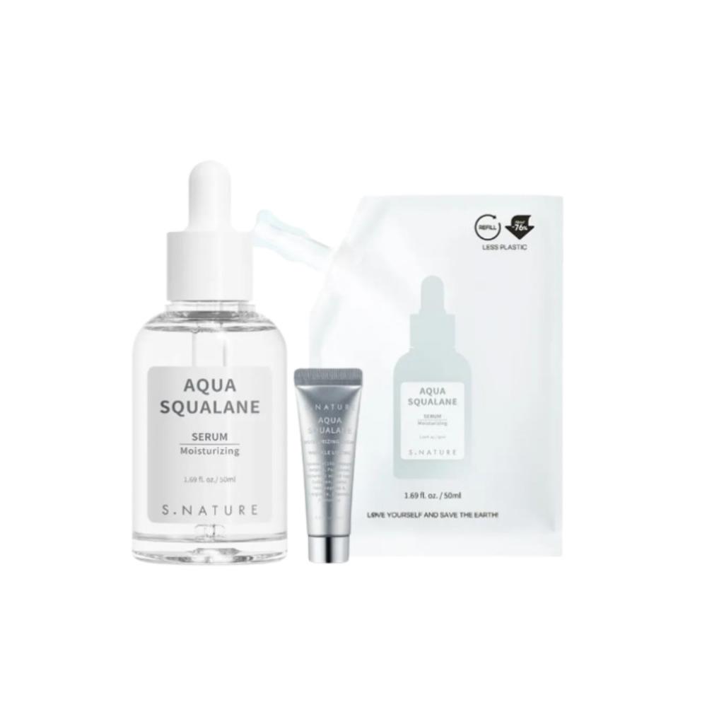 S.NATURE Aqua Squalane Hydrating Serum delivers deep moisture while helping strengthen the skin’s natural barrier. Enriched with squalane and hydrating ingredients, it helps lock in moisture and maintain soft, balanced skin throughout the day. The lightweight serum texture absorbs quickly without stickiness, leaving the skin smooth and refreshed. This special set includes a 50ml refill and a 10ml moisturizing cream for convenient daily hydration and travel use.